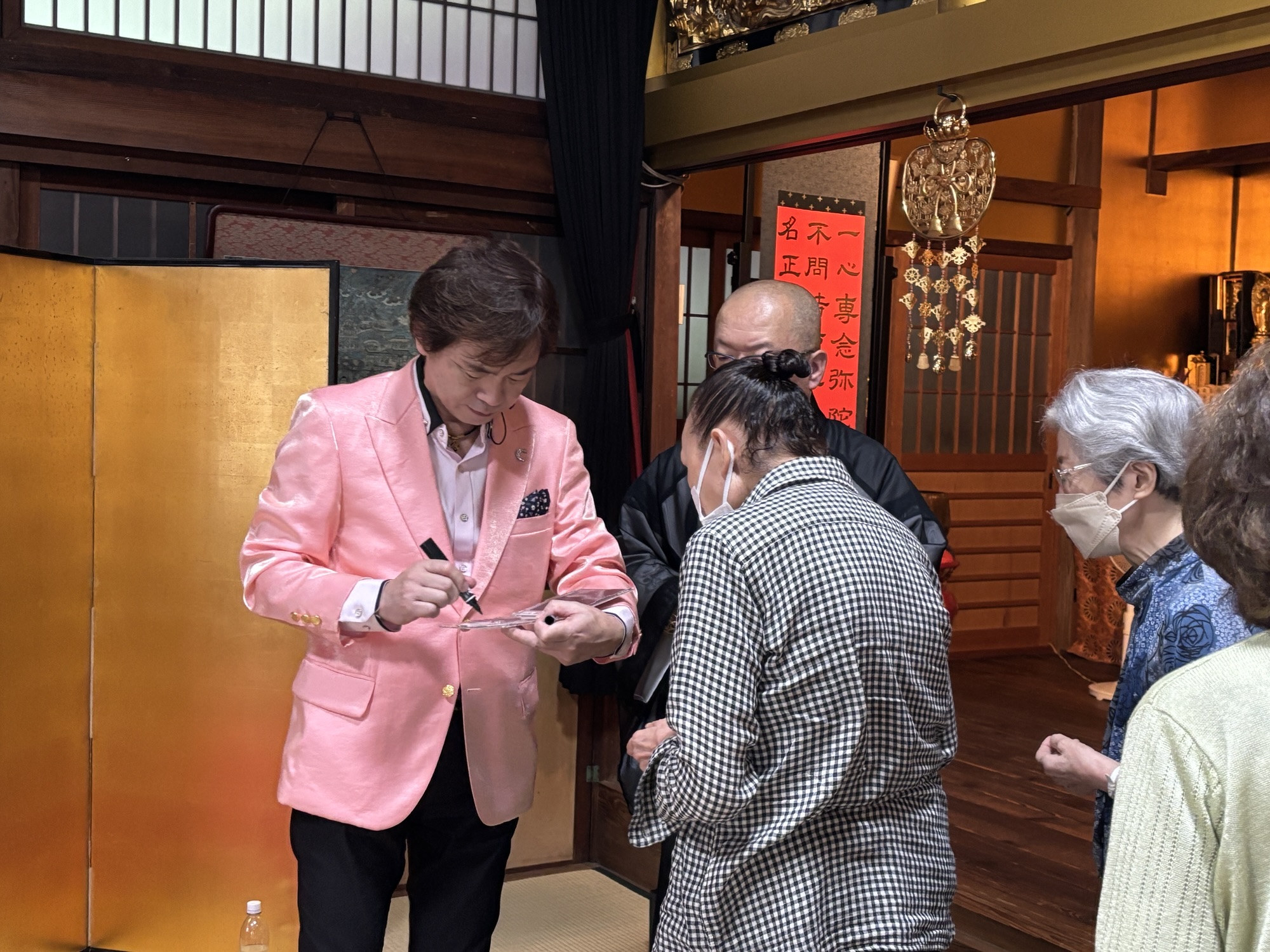 新曲の「螢火」、歴代紅白曲のメドレーなども交え、プロの歌声を間近に感動✨しました😊ショーの後は、サイン撮影会!初めての手作り推しうちわ😆どなたとも気さくにお話され、最後までお檀家さまのお見送りもしていただきました。